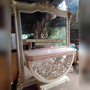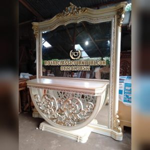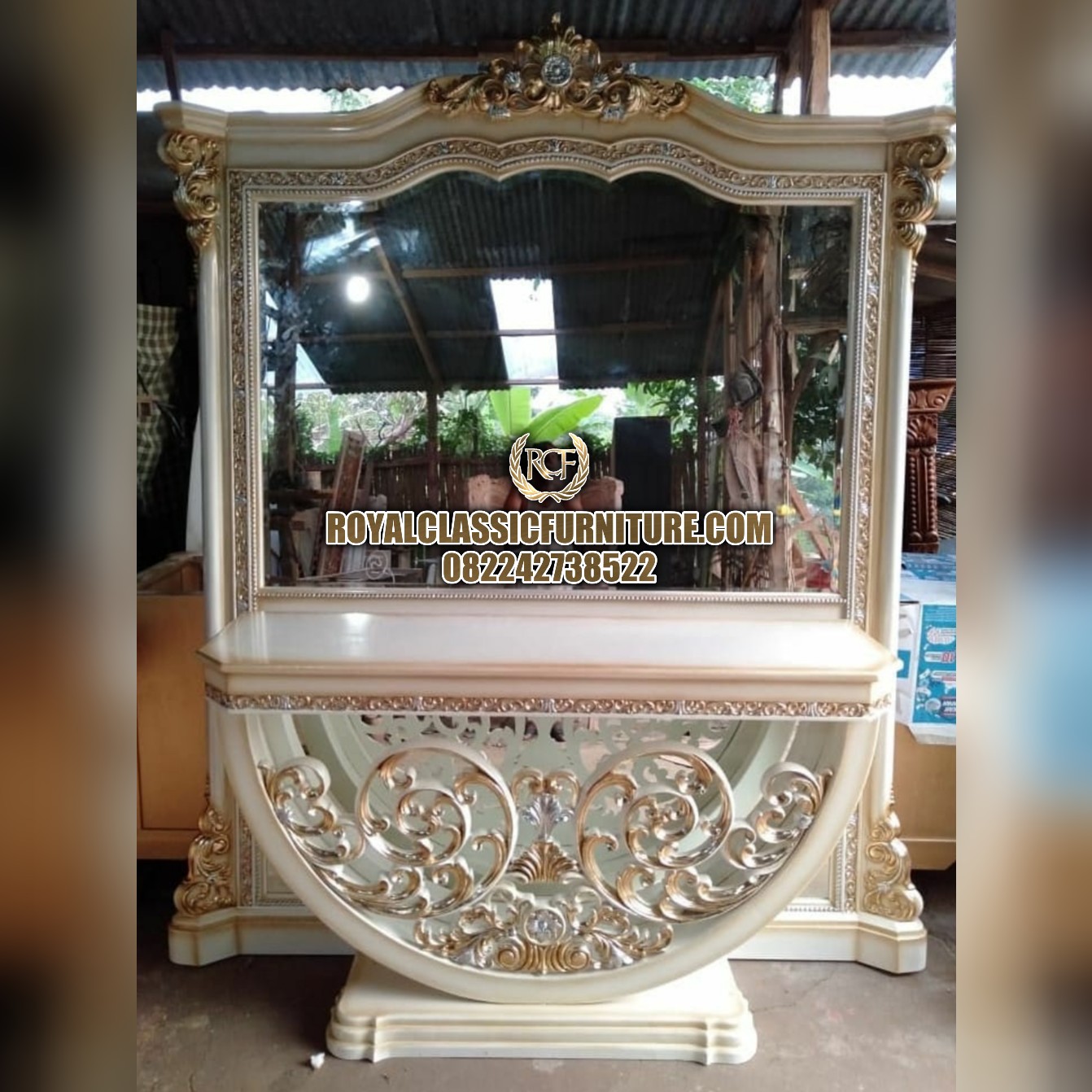 Meja konsol ukiran klasik merupakan perabotan rumah yang gak terlalu besar tapi mempunyai fungsi yang sangat besar , salah satunya bisa untuk menaruh pajangan , foto dan juga meja konsol ukiran klasik ini dilengkapi dengan pigura cermin yang sangat mewah dengan ukiran halus asli buatan tangan bukan mesin jadi mempunyai nilai yang tidak bisa diukur , karna diukir dengan tangan seniman ukir yang sudah ahli dan berpengalaman mengukir hasilnyapun sangat bagus dan menakjubkan karna kayu yang polos dibuat ukiran sebagus itu , mengukir sebagus itupun gak sembarangan orang yang bisa karna harus berlati berbulan – bulan bahkan ada yang bertahun – tahun baru bisa dan ada yang juga gak bisa karna untuk menghasilkan karya ukir yang indah harus mempunyai jiwa seni yang tinggi.